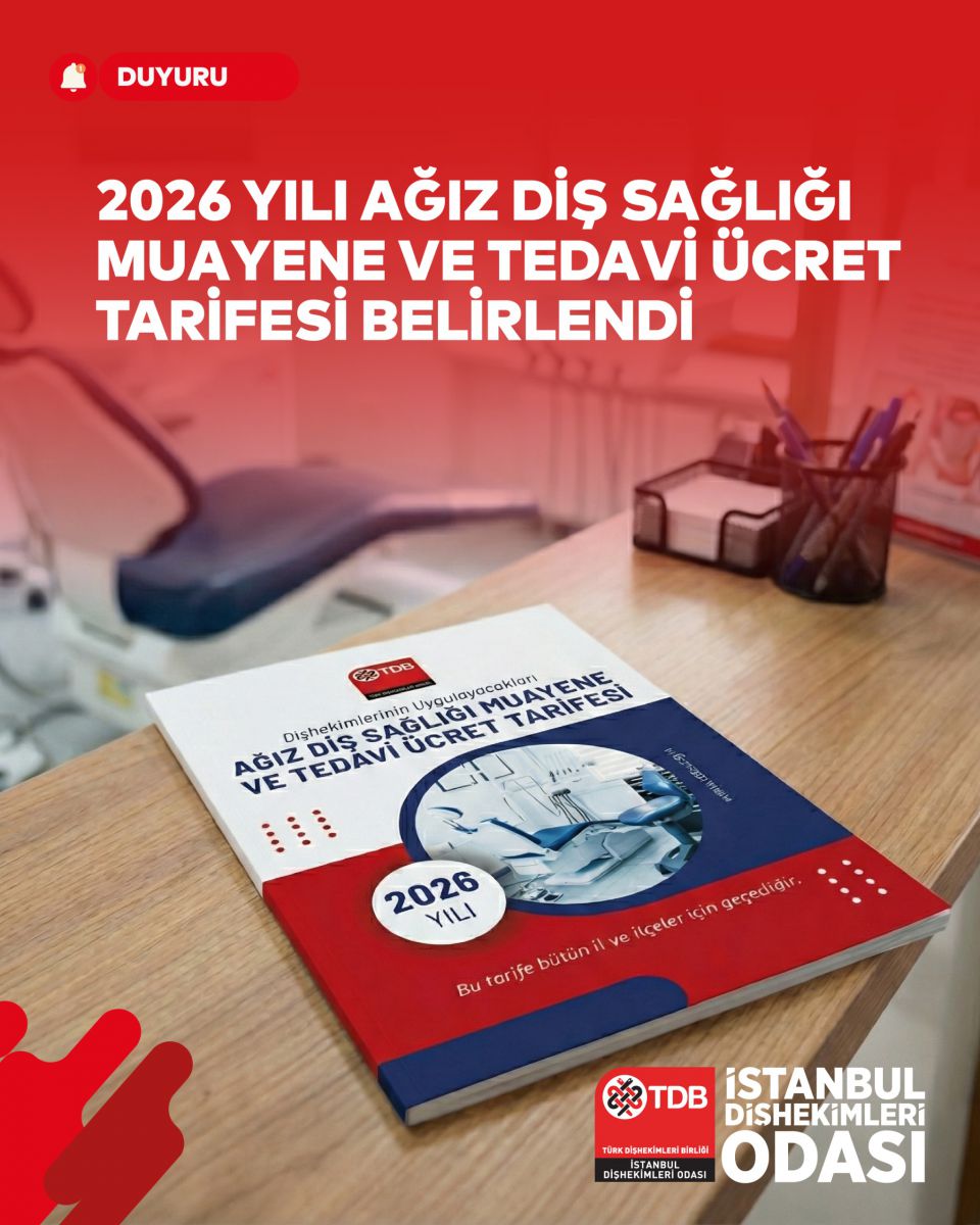 Meslektaşlarımızın 1 Ocak 2026 tarihinden itibaren yıl boyunca uygulayacakları Ağız Diş Sağlığı Muayene ve Tedavi Ücret Tarifesi, 10 Aralık 2025 tarihli TDB Merkez Yönetim Kurulu toplantısında kabul edilerek Sağlık Bakanlığı’na gönderilmiştir.